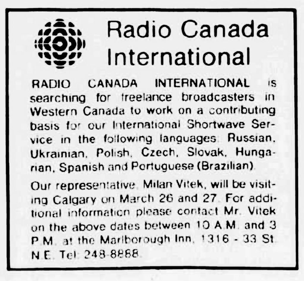 V průběhu několika let jsem pracoval v různých firmách, než jsem na podzim 1954 zakotvil u firmy Custom Sound & Vision pana Willamse, nejdříve jako technik hi-fi systémů, později jako prodavač. V této profesi jsem pokračoval v dalších dvou firmách, než jsem koncem roku 1962 vyhrál konkurs na místo redaktora v československé sekci kanadského rozhlasu CBC v Montrealu. Zůstal jsem tam v různých funkcích celkem dvacet pět let. Psal jsem, překládal, vysílal, doprovázel i československé návštěvy a delegace při zájezdech do Kanady, natočil jsem stovky rozhovorů. Všichni přitom věděli, že jsem politický uprchlík – Kanaďané, členové delegací, tedy sportovci, umělci, vědci, i komunističtí funkcionáři. Nikdy jsem ale nekompromitoval sebe ani své vyhraněné politické přesvědčení. V roce 1977 jsem byl jmenován ředitelem kanadského vysílání v osmi jazycích do střední a východní Evropy. Razil jsem názor, že obyvatelé zemí v tomto regionu sami nejlépe vědí, jak se jim daří. Nepotřebuji to proto slyšet ze Západu. Jsou naopak zvědaví, jak žijí a co dělají Kanaďané. O tom, že jsme měli u posluchačů v Československu úspěch, svědčí i pozdější založení Společnosti přátel Kanady. Čtyři roky (1983-1987) jsem vykonával funkci zástupce programového ředitele rádia a úzce přitom spolupracoval s Hlasem Ameriky i Rádiem Svobodná Evropa. Do důchodu jsem odešel v listopadu 1978, ale nadále pokračoval v práci.