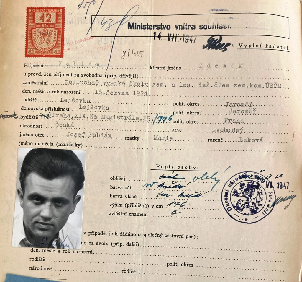 Fabiánova žádost o cestovní pas v roce 1947